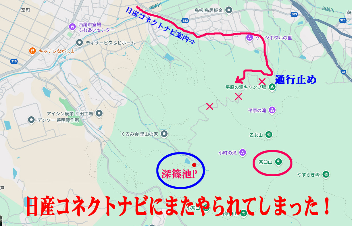 | 日産CONNECTナビ不具合事例多発・その13 | ひらさんの山歩き&花旅のブログ 日産コネクトナビに従ったら通行止めルートを案内! メイン道路まで戻って再設定するも結果は変わらず! 山歩きを諦めて観光に切り替え |