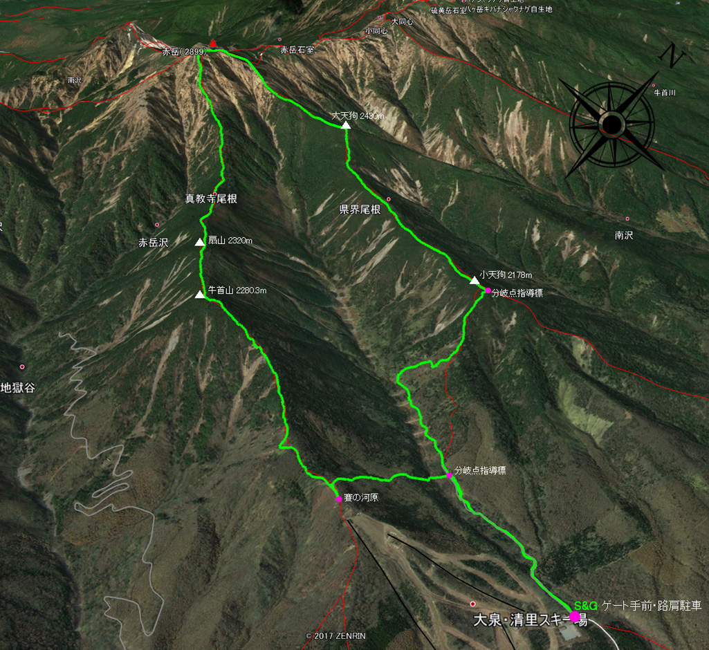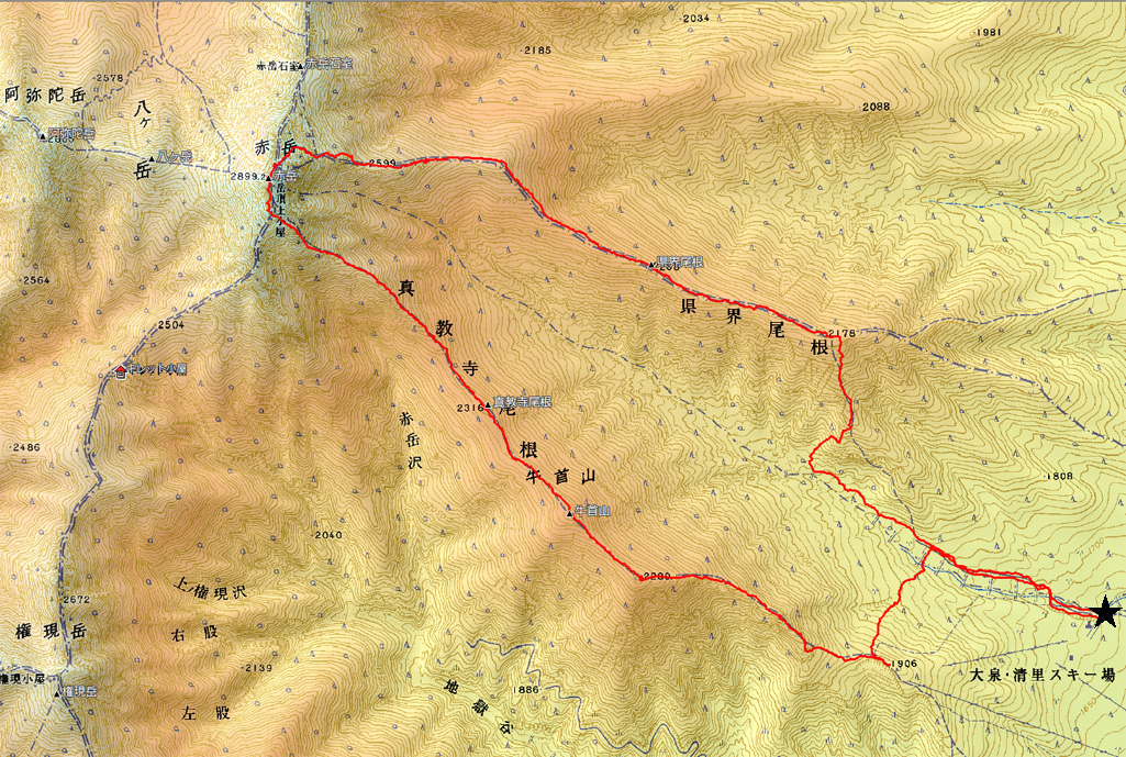 | 赤岳・真教寺尾根&県界尾根ルート地図 | ||||