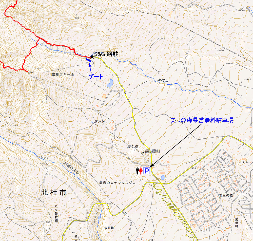 | 美しの森県営駐車場〜登山口拡大MAP | ||||