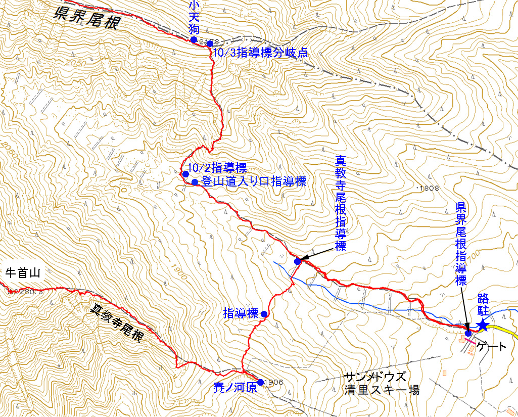 | 《最下段の拡大MAP参照》 真教寺尾根指導標で左折 |