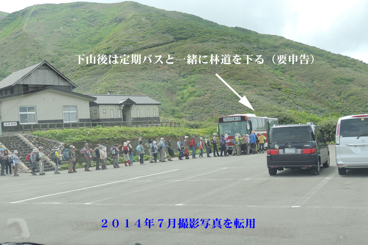 | 9時25分発のバスにひっつく! 自家用車で林道を降りるには滞在している係員に申告してバスの後部につく |
