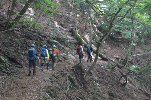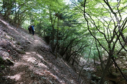 | 以後はこのように登山道が狭くなり、谷側への転落注意箇所が増えるので慎重に歩を進めたい | ||||