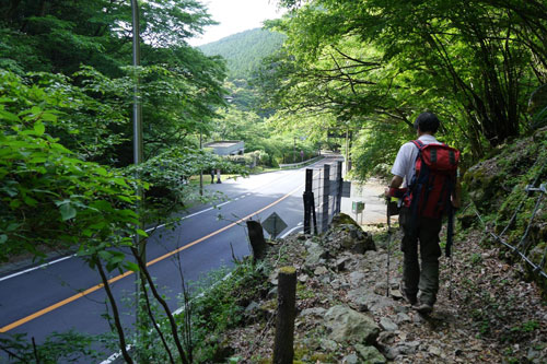 | 天城峠バス停へ下る | 車道と合流地点が天城峠バス停 | |||