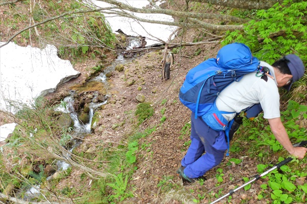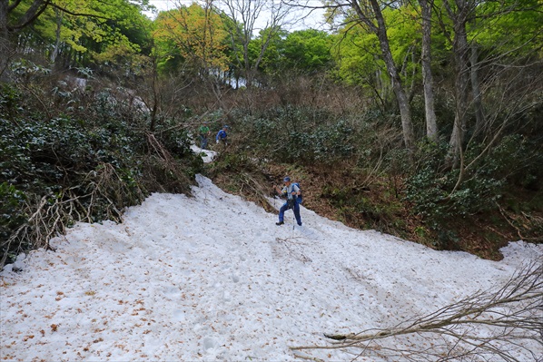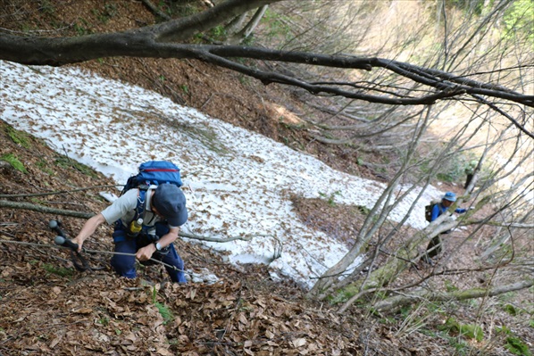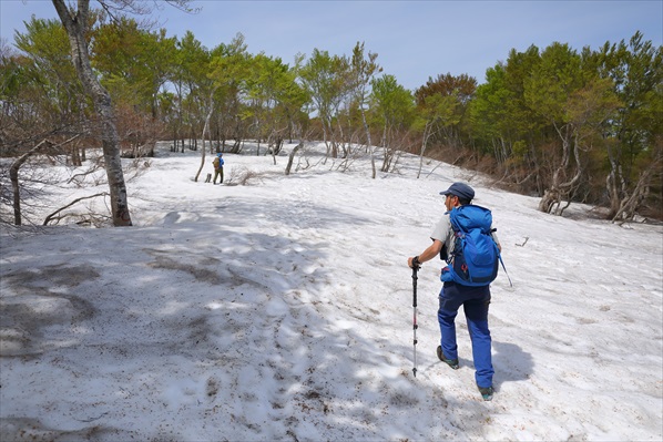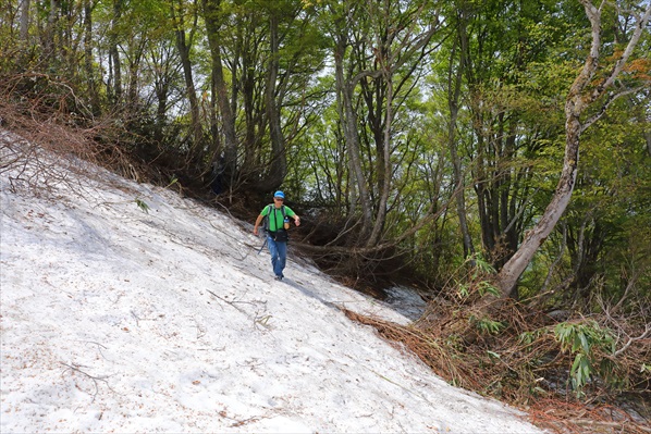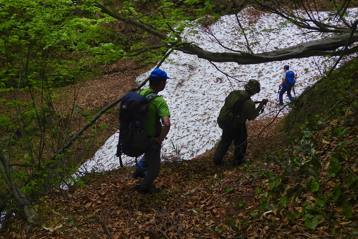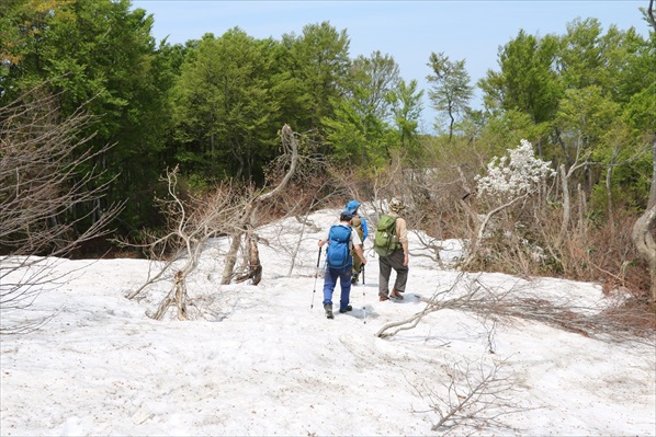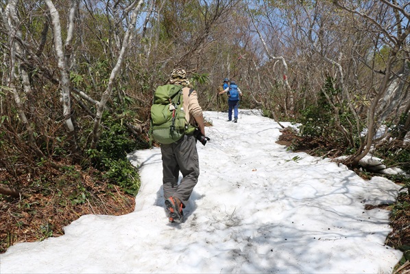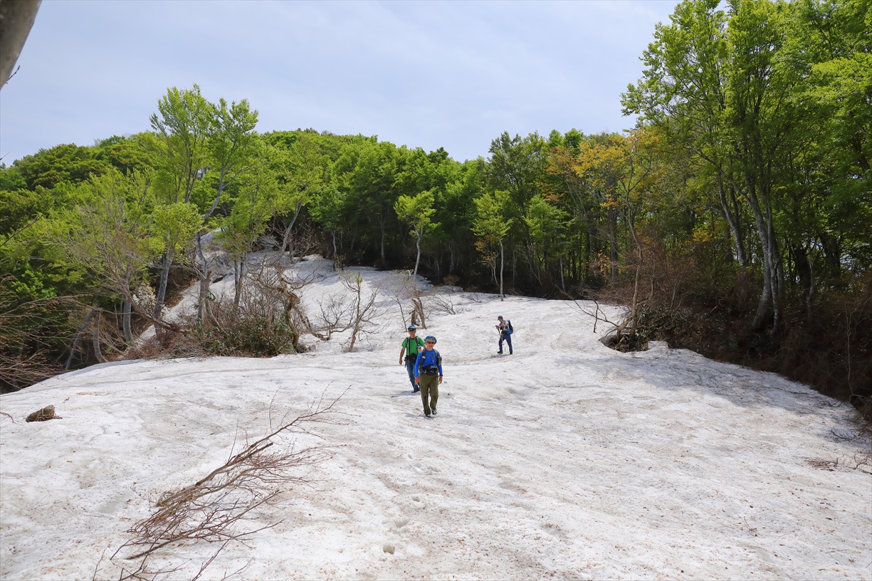 | 写真では伝わらないけれど激下りです! | ここからは暫く残雪地帯歩きに、、、 | |||
