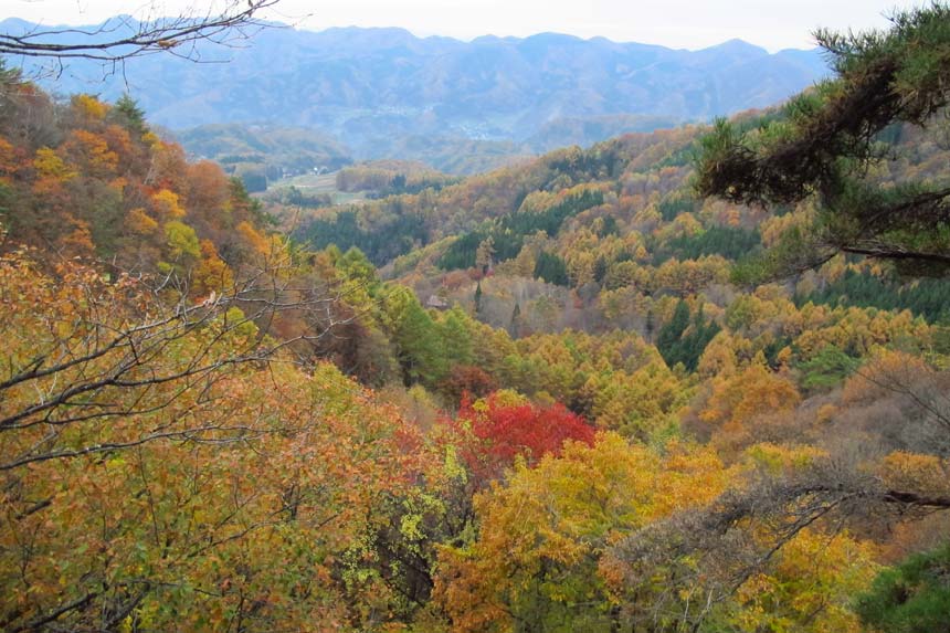谷間に見える屋根は荒倉キャンプ場内の能舞台と思われる |