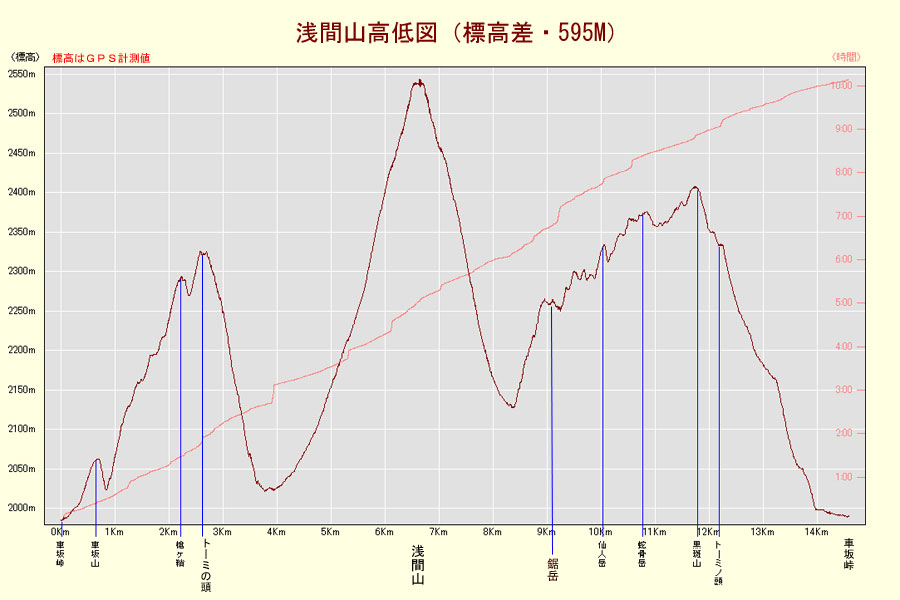 車坂峠登山口標高 1973M 標高差 595M 総歩行距離 14590M |