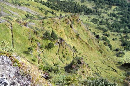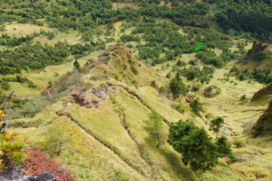 「草すべり」の急坂に九十九折れの登山道が矢印地点まで続く |