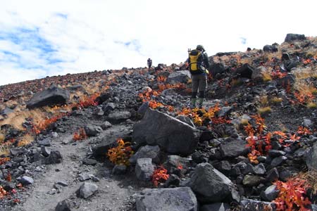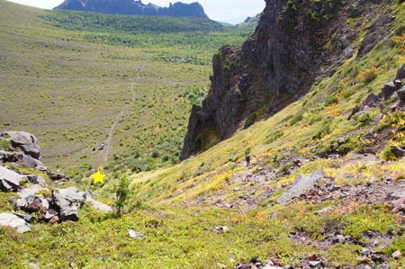 植物群を踏まないように砂礫地帯を選んで下る |