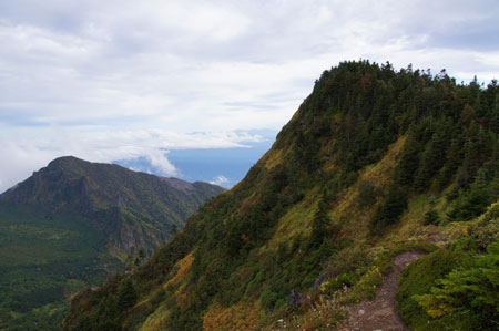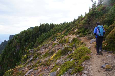 虎ノ尾の縁を登りこむ/鋸岳分岐点より |