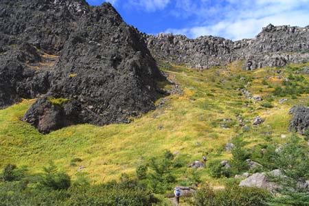 振り返れば外輪山奇岩群が覆い被さる |
