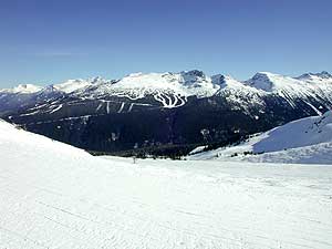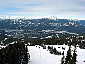 | BLACKCOMBスキー場・セブンスヘブン(谷の向こうはウィスラ−スキ−場) リフトは、目に見えている約3倍の距離で下に続いている。 (リフト一本の長さと、ゲレンデの広さを想像して下さい。) |