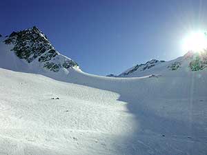 | Blackcomb Glacier このバーンは時間にならないと入れず、新雪を求めオープンと同時に先を争って滑り込みます。 |