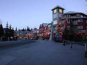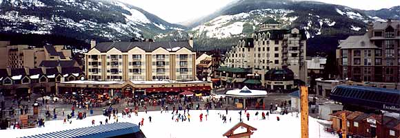 | ウィスラーを滑り降りるとウィスラーヴィレッジが目の前に!遠いホテルで歩いて10〜15分、 ひらさんは歩いて2分のホテルを予約します。 |