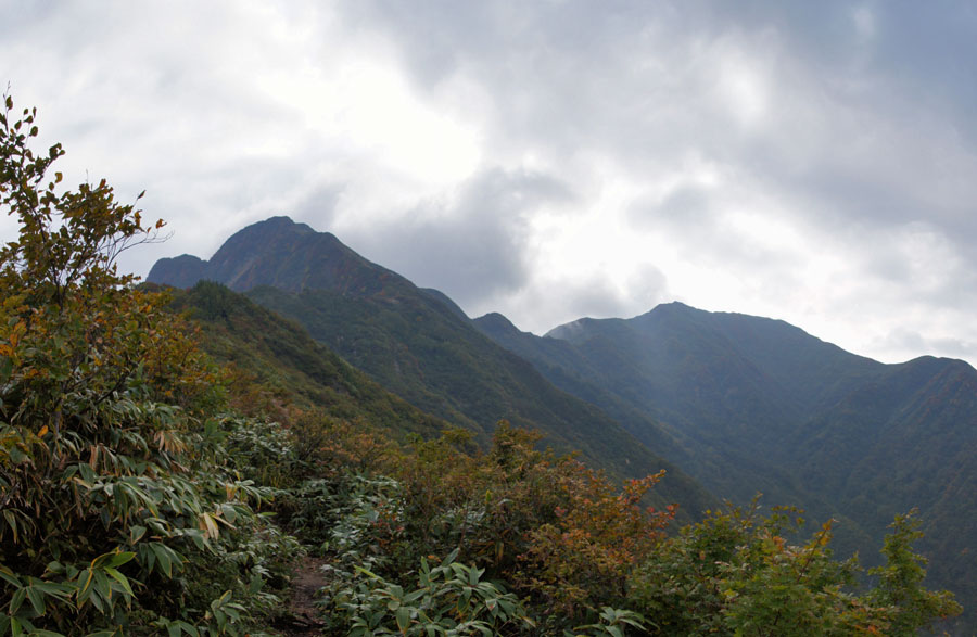 | 上越のマッターホルン・大源太山(左) 七ツ小屋山(中央右寄り最奧) 弥助尾根より | ||||
