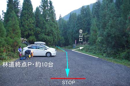 | 林道終点・駐車場 | 大源太山・登山口 | |||