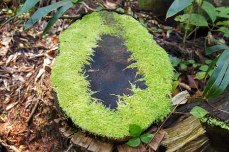 | 杉の木林を抜けて右に沢音を聞くと・・・ | 第1渡渉地点 星印をホップ・ステップ・ジャ〜ンプ で対岸へ |