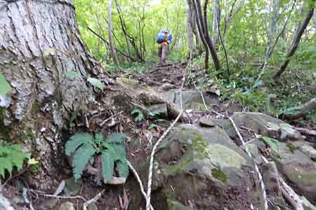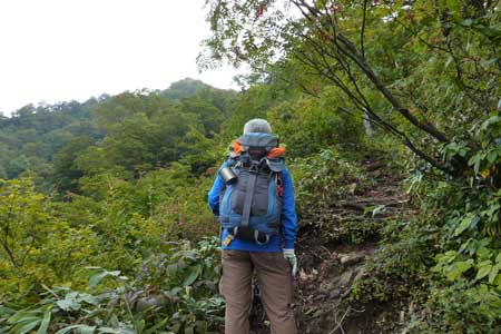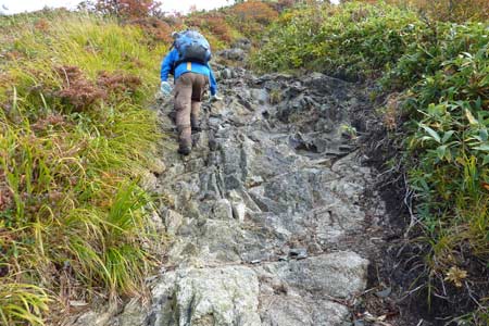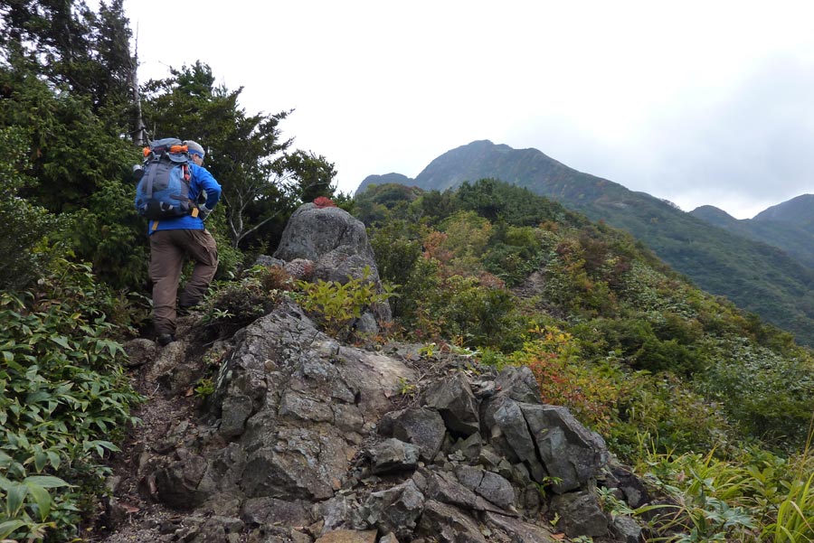 | この岩場をクリアすると急坂登りが終わり → | 支尾根上に飛び出せば大源太山が顔を見せる | |||