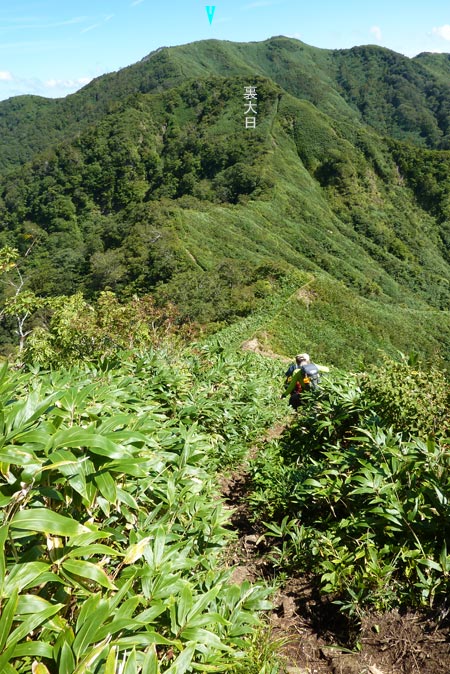 裏大日との鞍部へ一気に下るが、帰りはここを上り返さなければならないのだ〜〜 (;゜ロ゜) |