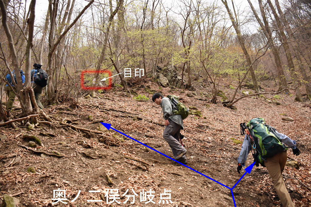 奥ノ二俣分岐点(登りは左R・下山は右R) |