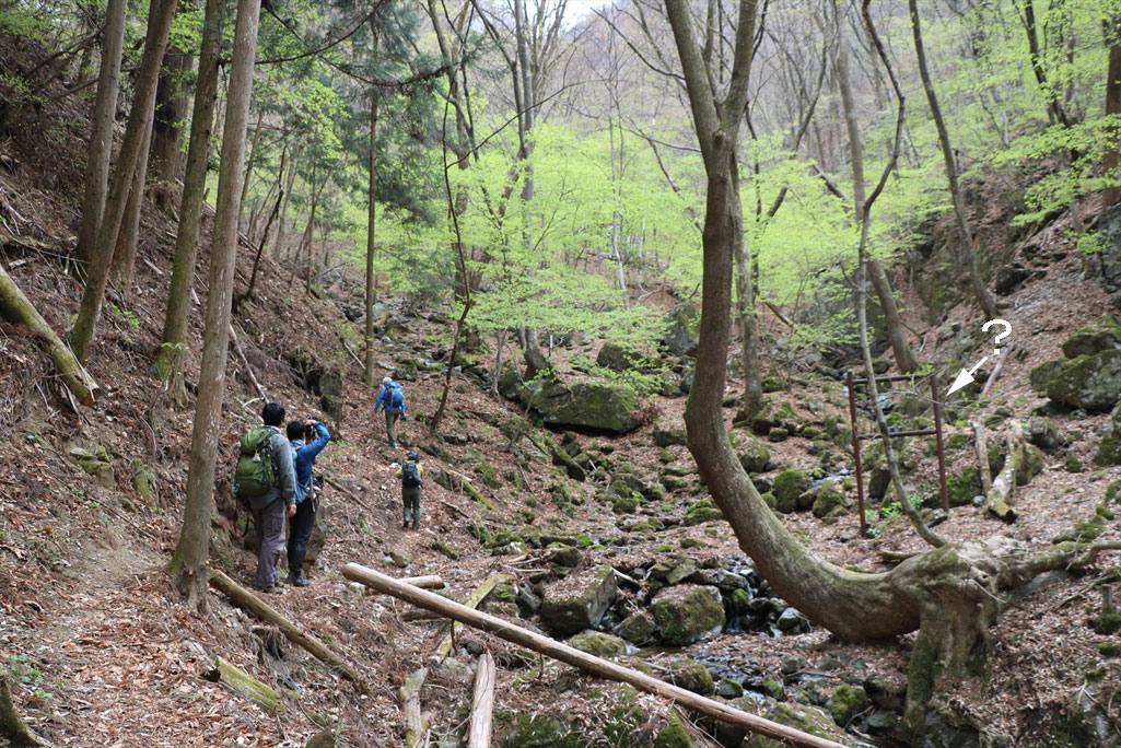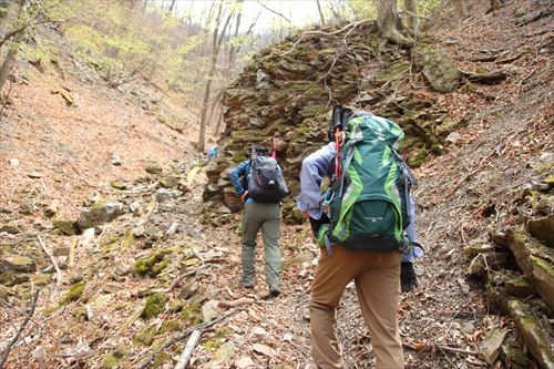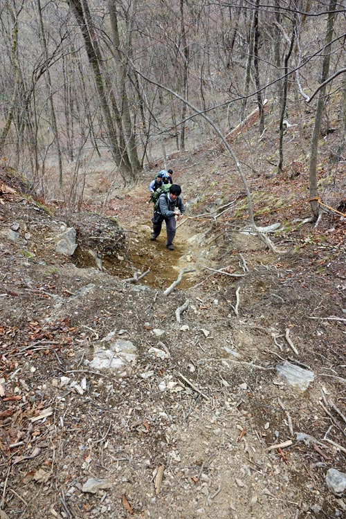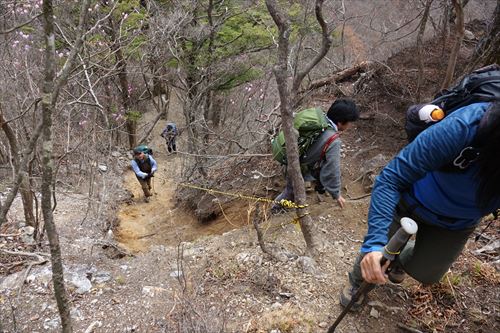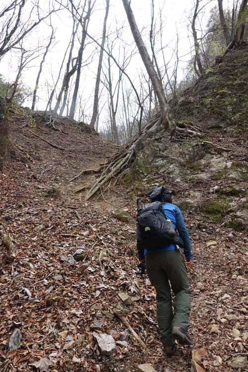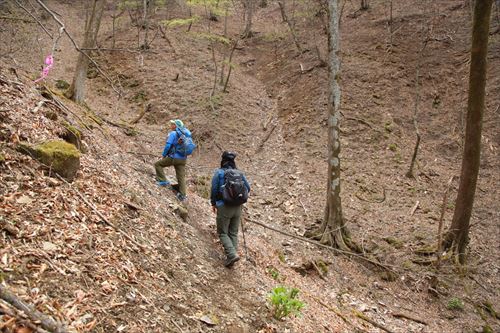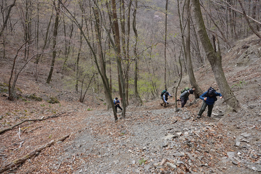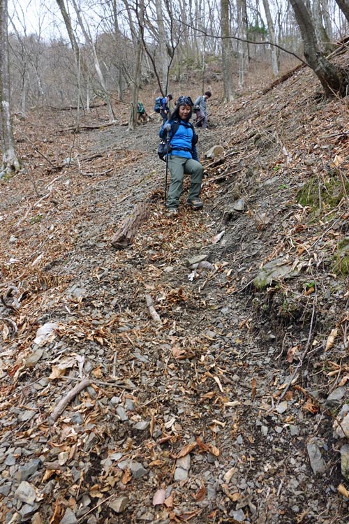 このルートも激下りのうえザレ道でグリップが効かず悪戦苦闘 |
