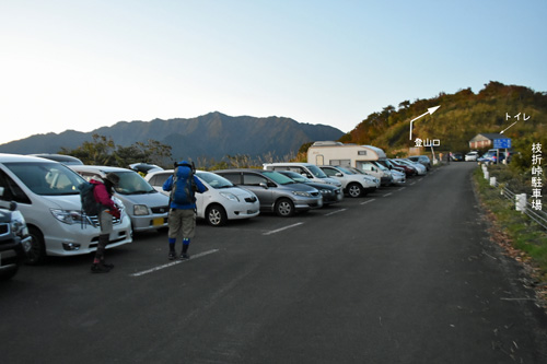 《↑画像クリックで拡大表示》 枝折峠駐車場はam4:50到着時で満車 (;´Д`) |