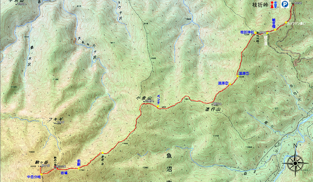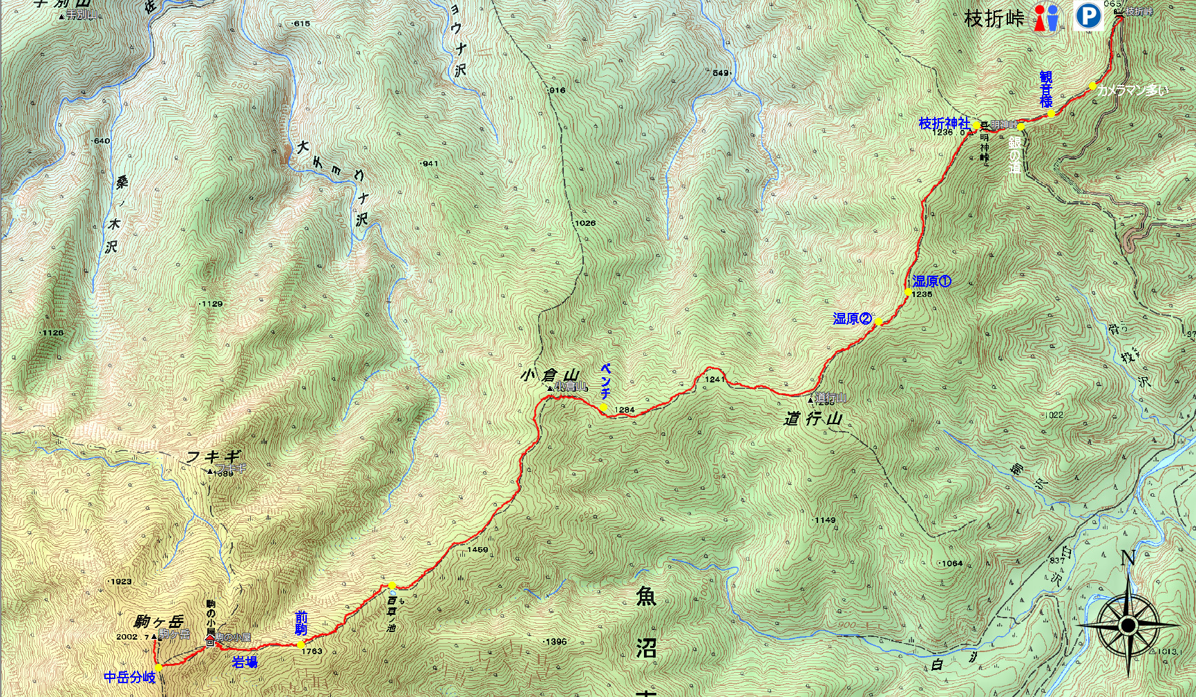 | (計曲線 50M 主曲線 10M) 枝折峠駐車場標高/1070m 標高差/933m 累積標高/1489m 総歩行距離/15135m |
