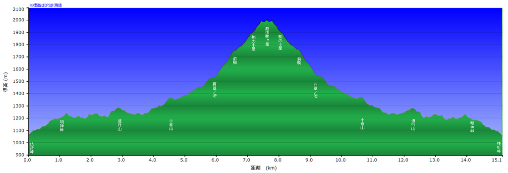 | 枝折峠駐車場標高/1070m 標高差/933m 累積標高/1489m 総歩行距離/15135m | ||||