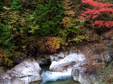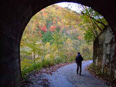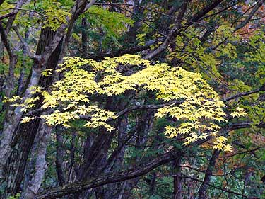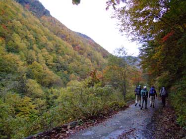 黄金色に輝く恵那山山腹と本谷川を左に見ながら20分ほど林道を進むとトンネルが現れ、ここを抜ける