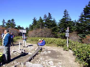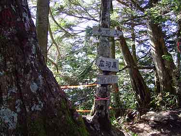 尾根の急坂を登り切り、恵那山の肩下付近に出ると「山頂まで20分」の標柱があり、ここからは南斜面