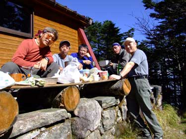避難小屋前では、ごっちゃんの「おでん」を肴に、こばさん、ヒロちゃんの「銘酒・真澄」で昼の宴を・・・