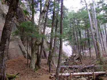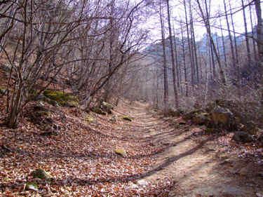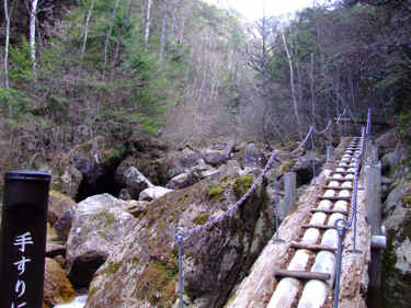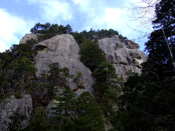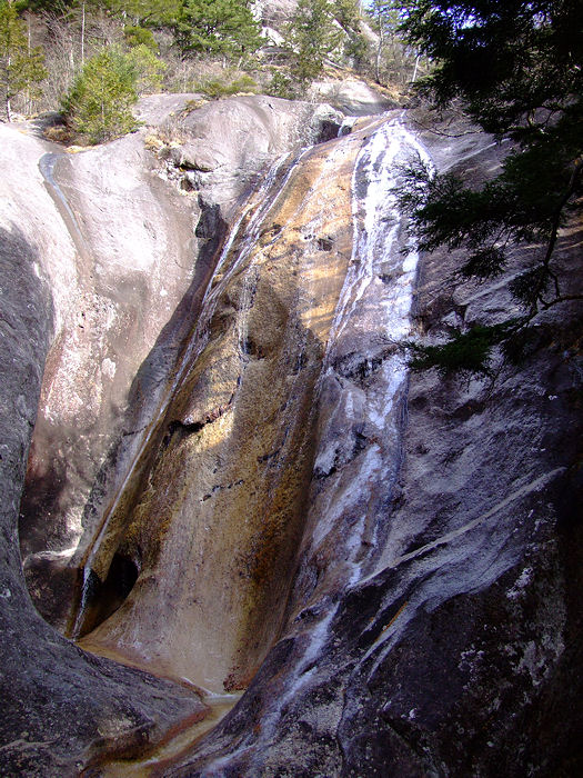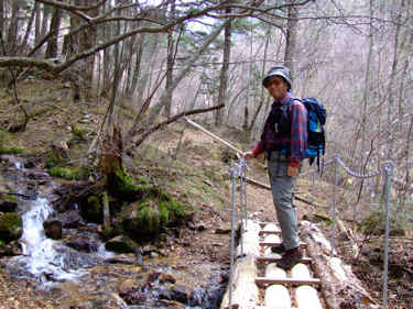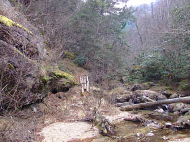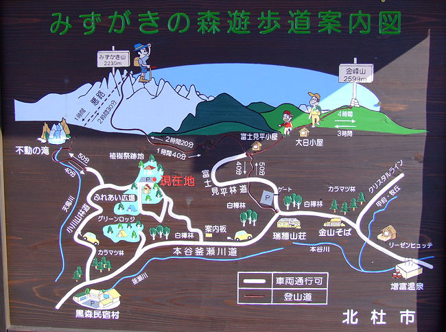 | アクセス 下の「みずがきの森遊歩道案内図」参照 画像クリックで拡大表示されます。 不動滝(瑞牆山)ルート解説 ふるさと広場を通過し、小川山林道と合流したら右折して林道終点地点に向かう。 右折して直に未舗装となりRV車以外は腹を何回も擦るであろう悪路となる。 小さな橋を渡った場所が終点で7・8台の駐車スペースがある。 駐車場所から雑木林の広い道を瑞牆山目指して進むと、瑞牆・不動滝の指導標が現れここで左に折れる。 イグアナの形をした岩峰や、ロッククライマーには垂涎の的になりそうな大岩を通過すると不動沢に沿って 架かる立派な木橋が現れる。 ここから沢づたいに岩峰や沢の景色を楽しみながら20分ほど歩くと不動滝に出る。 各木橋には「手すりに注意」の標柱があり最後の9つ目(古い橋は除く)を渡った場所が不動滝だ。 次回の下見を兼ね少し先まで足を延ばしてみたが、地図に書いてあるとおり荒れた登山道で不動滝までの ハイキングコースと比べれば雲泥の差であった。 mikio コメント 瑞牆山は何回か登ったが、ミセスハイジさんのブログを拝見するまで不動滝の存在をしらなかった。 一風変わったこの滝を、春先に雪解け水がとうとうと流れる姿を思い浮かべながら眺めてきました。 |