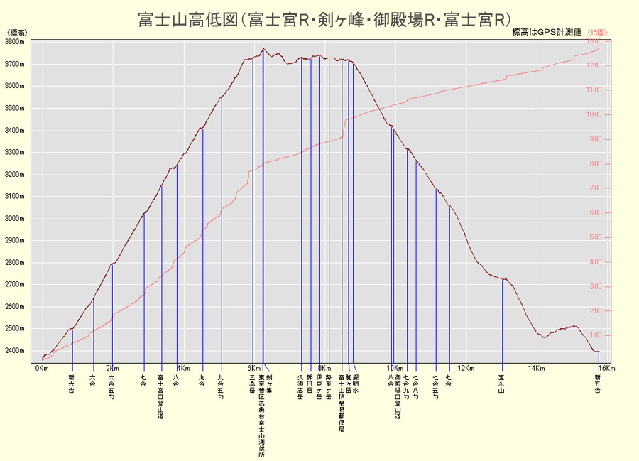 五合目レストハウス駐車場標高/2370M 標高差/1405.6M 総歩行距離/15763M |