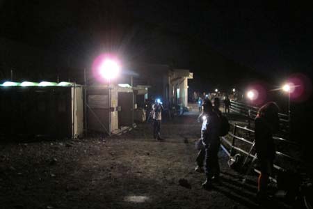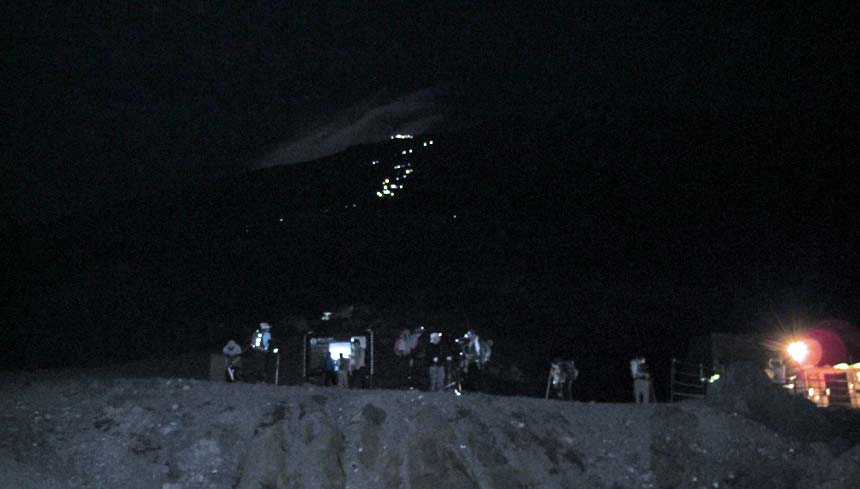 | pm 23:53 ↕ 六合目(2390M)・富士山安全指導センター/小屋の灯りが富士山頂まで続く |