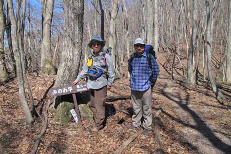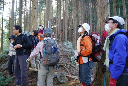 | 尾根ルート分岐点手前の杉林で休憩中 登山にもマスクが必需品になってきましたね〜 |