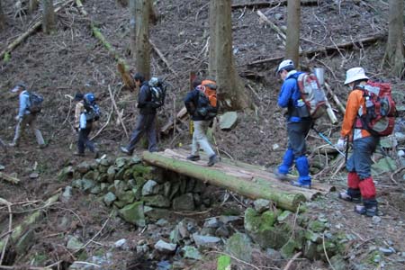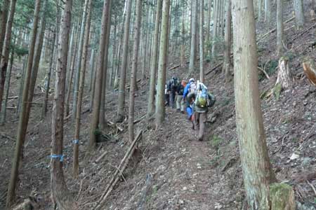| 丸太橋を渡る/山頂まで3.7km地点 | 九十九折れの急坂が尾根R分岐点の稜線上まで続く | |||