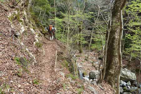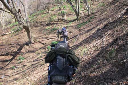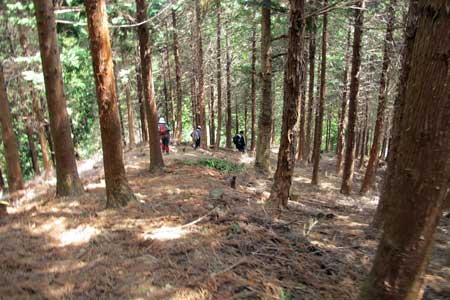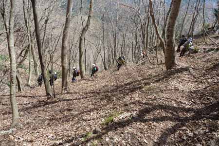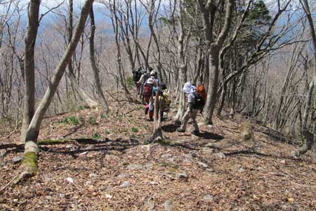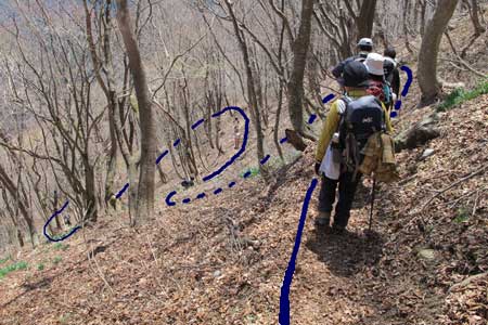 | 小舟伏山を通過するとミズナラなど広葉樹林の急坂下りとなる。 西ルートも九十九折れで真下を登山者が歩いているので落をおこさぬよう慎重に歩きたい。 |