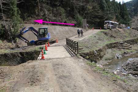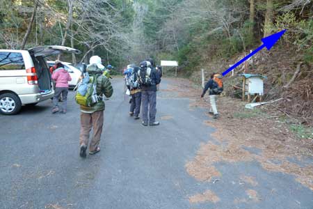 | ひと歩きで → | あいの森広場(西ルート登山口)に到着 赤矢印で東ルート登山口へ向かう |