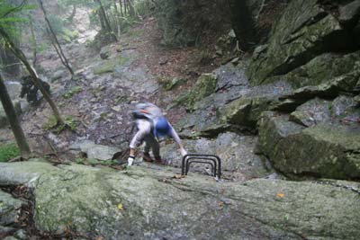 滝の横にかかるクサリを登り、石に苔が付着して滑りやすい沢道を進むと「〆張場」と呼ばれる分岐点