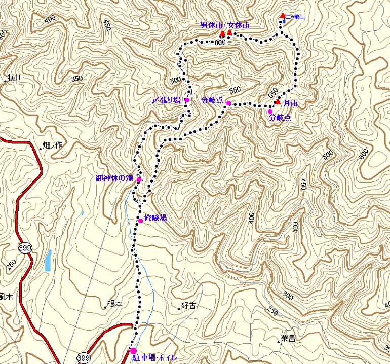 女体山がある二ツ箭山直登ルートだ。