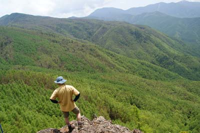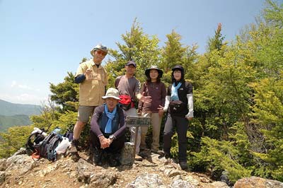 五郎山山頂下の展望適地に立つ仲間/東肩より山頂 |