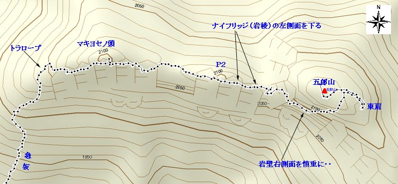 「マキヨセの頭」東側岩稜部をP2と表記した出版物もありますが当サイトでは五郎山手前の岩稜2100m地点をP2としております。 |