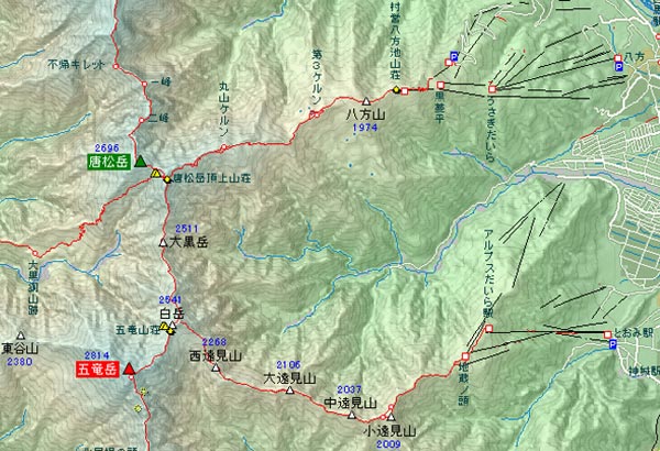 クリックすると「唐松岳・五竜岳」近辺の広域地図を見ることが出来ます。 |