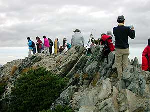 | 解説 唐松岳頂上山荘から五竜岳に向かう。 岩稜を下り大黒岳をすぎ、シラビソの樹林に入ると、唐松岳と五竜岳の最低鞍部に出る。 鞍部からは登りになり、ハイマツ帯のザレた斜面を行く。 白岳ノ肩で遠見尾根からの道と合流し、五竜山荘へ下る。 山荘からは岩稜の道を進むが、尾根の右を巻き、やがてジグザグの道を急登し、稜線に出る。 ぺンキ印にしたがって登っていく。 山頂直下には短いクサリがあり、これをすぎてまもなく、キレット方面の標識が現れる。 五竜岳山頂はこの少し先だ。 三角点は西のピーク上にあり前方には、鹿島槍ガ岳が、振り返れば唐松岳と白馬三山が迫力ある 姿で迫ってくる。 『山と渓谷社・長野県の山』より抜粋 |