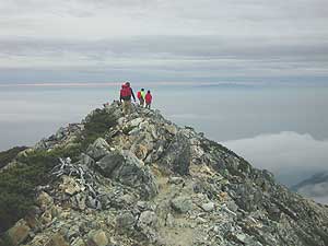| 行程&所要時間 『二日目』 9月22日 五竜岳山荘テン場発 6:30 〜 五竜岳山頂着 7:30 山頂発 7:45 〜 テン場着 8:25 (テントを片づける) 五竜岳山荘発 9:10 〜 西遠見 10:10 〜 大遠見 10:30 〜 中遠見 11:05 〜 小遠見 11:35 〜 地蔵の頭 12:20 〜 アルプス平山頂駅着 12:37 |
