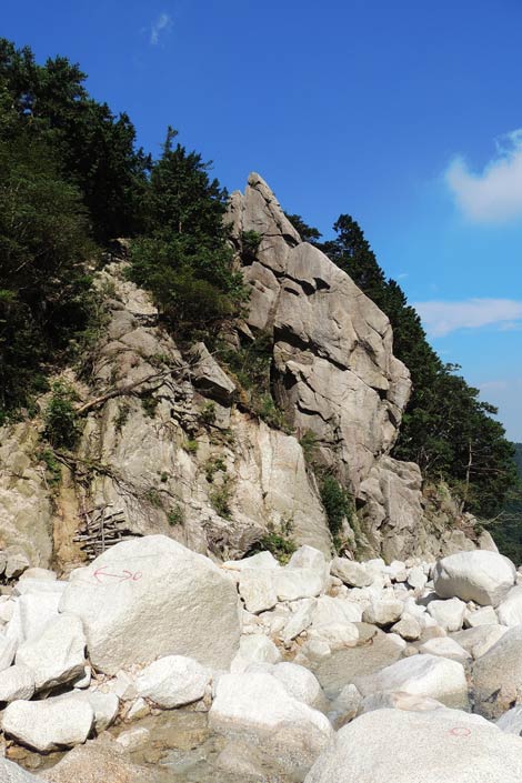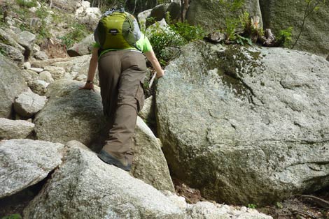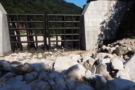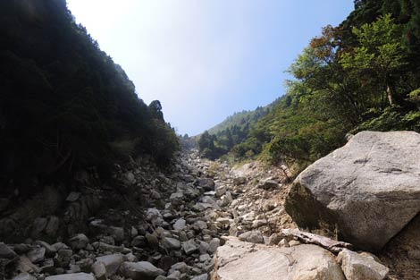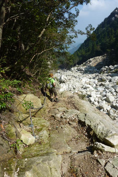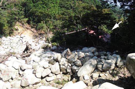 七の渡しを通過したら山沿いに進むのが正規ルートだが砂防ダム鉄枠をくぐり日向小屋の対岸に出る |