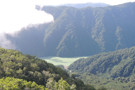 御前峰から望む大汝山と油ヶ池(左)・紺屋ヶ池(右) |
