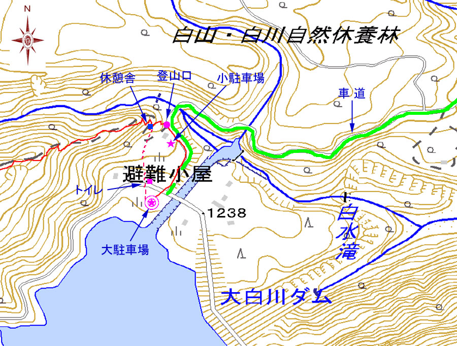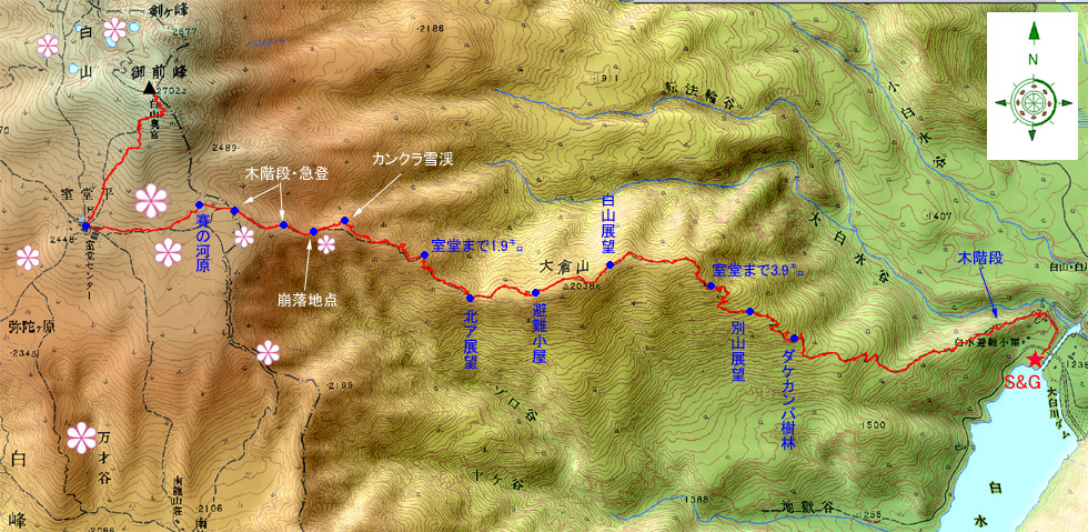 大白川駐車場標高/1230M 標高差/1472.2M 総歩行距離/16101M |