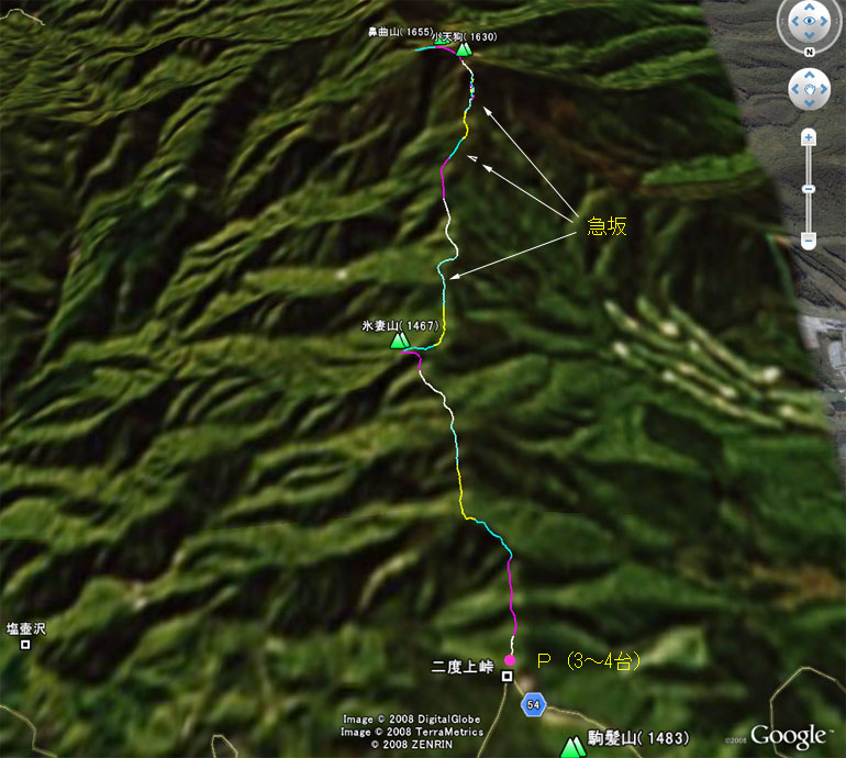 下段の地図を見ても分かるように、氷妻山山頂から鞍部まで急坂を下った後は倍の登りが待ちかまえて