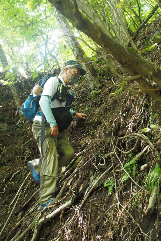 | 氷妻山への登り返し 急登につきマスクをはずすが10b間隔を保つ |