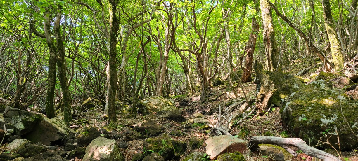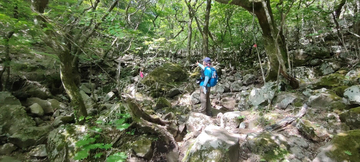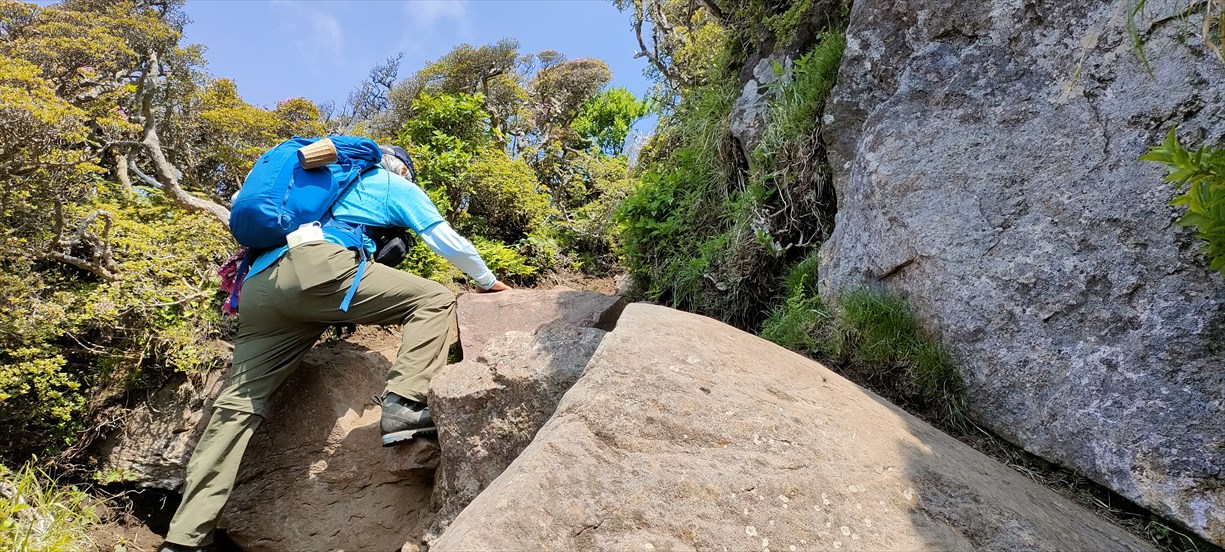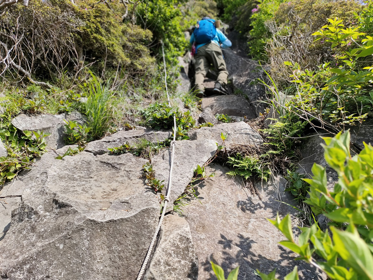 | 平治岳へは上り下り一方通行になっている/囲み部分は下の写真岩場箇所 平治岳山頂はここを登り切った先にあるのでガックリしないように、、、笑 |